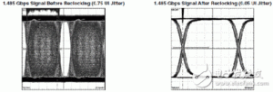 SDI 重定時(shí)器是用來(lái)自動(dòng)檢測(cè)輸入信號(hào)類型,調(diào)整自身的PLL和CDR電路而恢復(fù)和整形出低抖動(dòng)的時(shí)鐘,再重新定時(shí)發(fā)送出接收到的SDI信號(hào),以降低SDI信號(hào)的抖動(dòng)。雖然均衡器也可以降低SDI信號(hào)的抖動(dòng),但它和重定時(shí)器是兩種完全不同的器件,兩者不可相互替代。均衡器的作用是通過(guò)增加高頻增益使傳輸通道頻率響應(yīng)趨于平坦來(lái)改善眼圖和信號(hào)抖動(dòng),而重定時(shí)器則是通過(guò)PLL和CDR來(lái)抑制和降低累加噪聲。如果SDI傳輸通道很長(zhǎng)或者傳輸過(guò)程中被其他噪聲和干擾惡化,僅有均衡器還不足以改善信號(hào)的質(zhì)量,此時(shí)在均衡器輸出端再串接一個(gè)重定時(shí)器是一個(gè)理想的提高SDI信號(hào)質(zhì)量的方案。圖5描述了重定時(shí)器的去抖效果,可見(jiàn)眼圖和抖動(dòng)被明顯改善。
