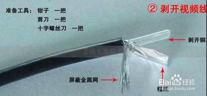 2拿過視頻線,記住如果線需要過墻或者穿過孔洞,一定要先穿線,然后再處理線,接線。如果不先把線布好,接上BNC頭后有的地方穿線就不那么容易了,所以一定要先布好線,選擇好長度,然后拿起視頻同軸線的一段,用壁紙刀將外皮處理掉。