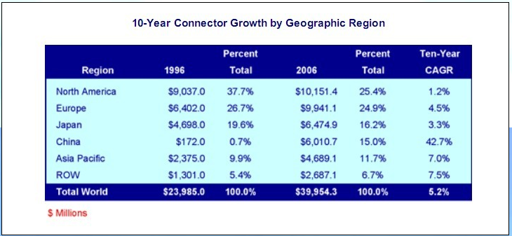 由以上統計可見,再生能源連接器的增長勢頭最近一兩年有些減緩. 取決于全球各國政府在未來可見的幾年的政策, 決策,未來中短期再生能源連接器的增長可能會保持較高的增速. 預測5年后(2016年)再生能源連接器的市場是4.14億美元,每年預增8.3%.
